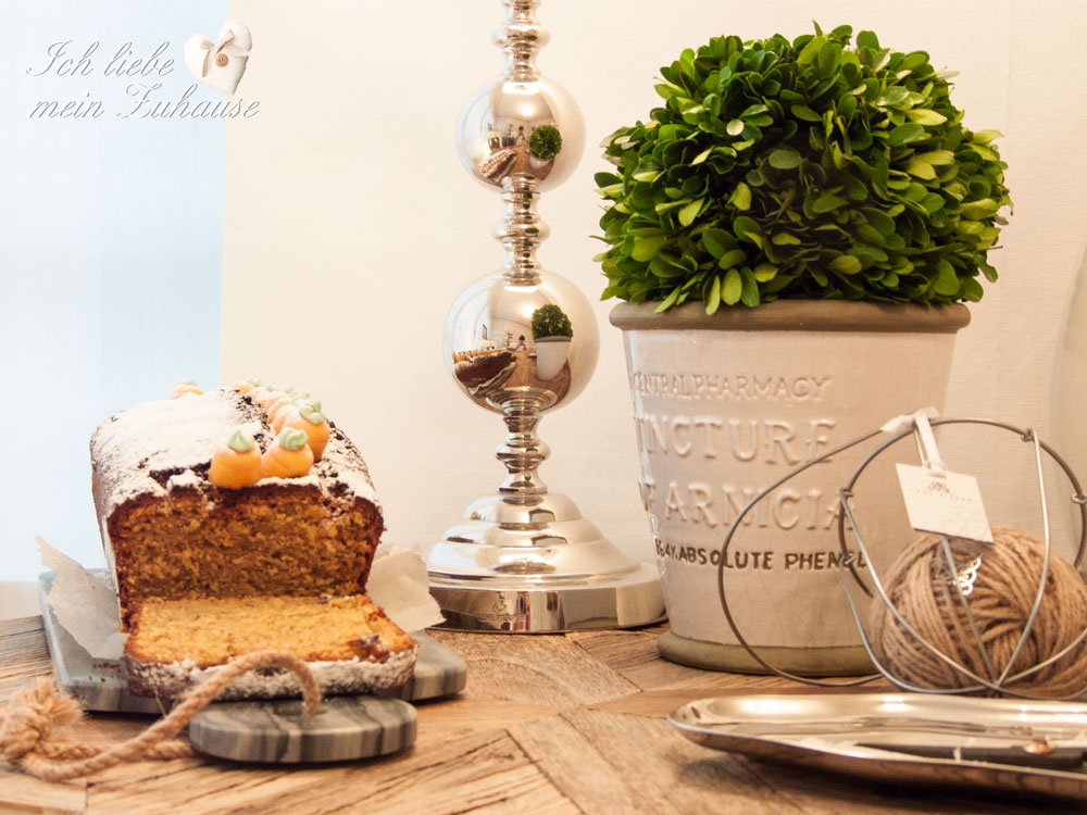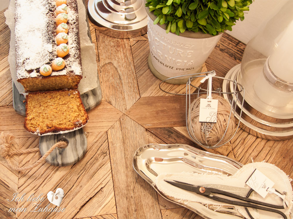 Einen saftigen Rüeblicake habe ich schon gebacken und die Schere mit der Schnur liegt auch schon bereit für ihren Einsatz oder einfach als Deko. Aus der Karyn Collection von Lene Bjerre. Das Marmorbrett ist aus der Marble Collection von Lene Bjerre und das Tisch-Windlicht ist aus der Floralina Collection. Der Apotheker Keramiktopf ist aus der Josephine Collection, von Lene Bjerre.