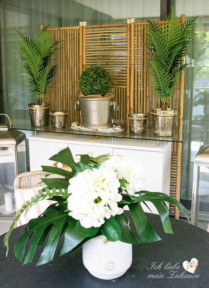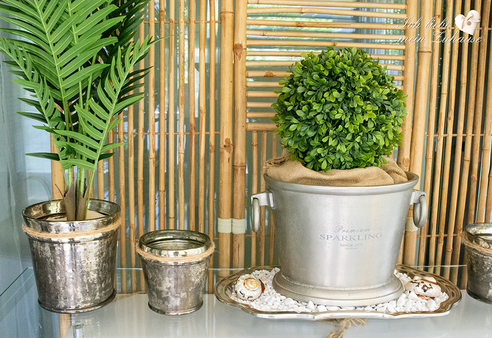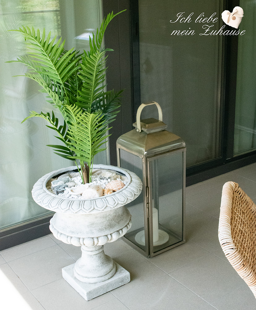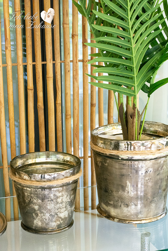 Die Blumentöpfe mit den Pflanzen sind aus dickem Glas, extra schwer gemacht und daher auch ideal für draussen. Sie sind von Lene Bjerre, aus der Amadea Collection, small und large, in Antikgold. Die kleineren Töpfe ohne Pflanzen, verwende ich als Windlichter. Am Abend scheint das Kerzenlicht zart durch das Antikgoldene Glas und verbreitet eine gemütliche Stimmung.