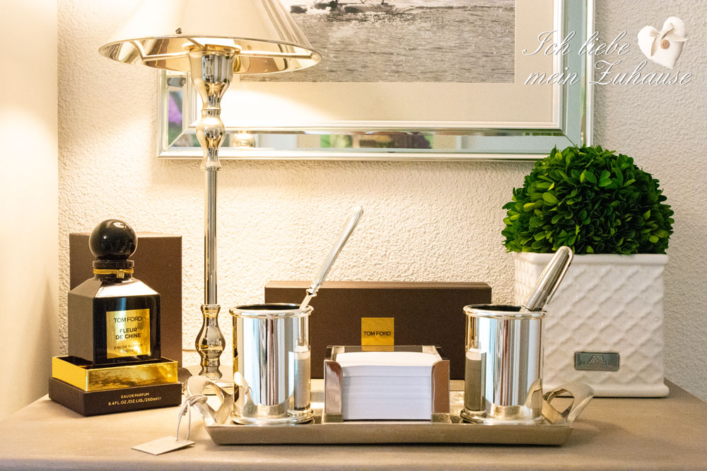 Wir lieben nicht nur Kunst und Bilder, sondern auch selber gemachte Fotos von unseren Erlebnissen als Erinnerung, in edlen Bilder- und Fotorahmen. Die Fotos lasse ich jeweils von einem Labor entwickeln und je nach dem auch vergrössern. Damit sie gut zum Interieur passen, wähle ich dafür schwarz-weiss. Von Lene Bjerre gibt es viele verschiedene Fotorahmen. Gerade im heutigen Handy-Zeitalter sind Fotorahmen wieder sehr beliebt und liegen im Trend. Die silbrige Tisch-Lampe welche auf der Kommode steht, eignet sich auch wunderbar als Büro-Lampe. Weil der Schirm ebenfalls aus Metall ist, blendet sie nicht und gibt trotzdem helles Licht zum Arbeiten. Die Tisch-Lampe ist aus der Tinea Collection, von Lene Bjerre.