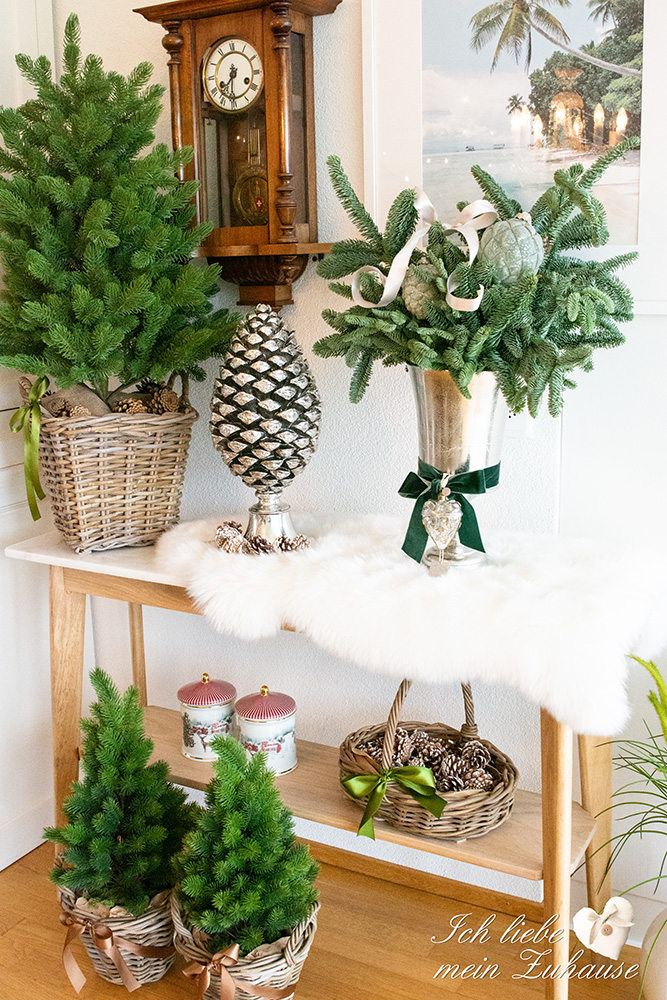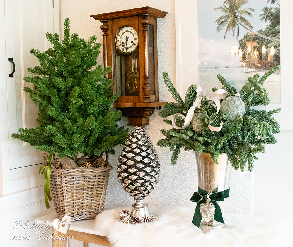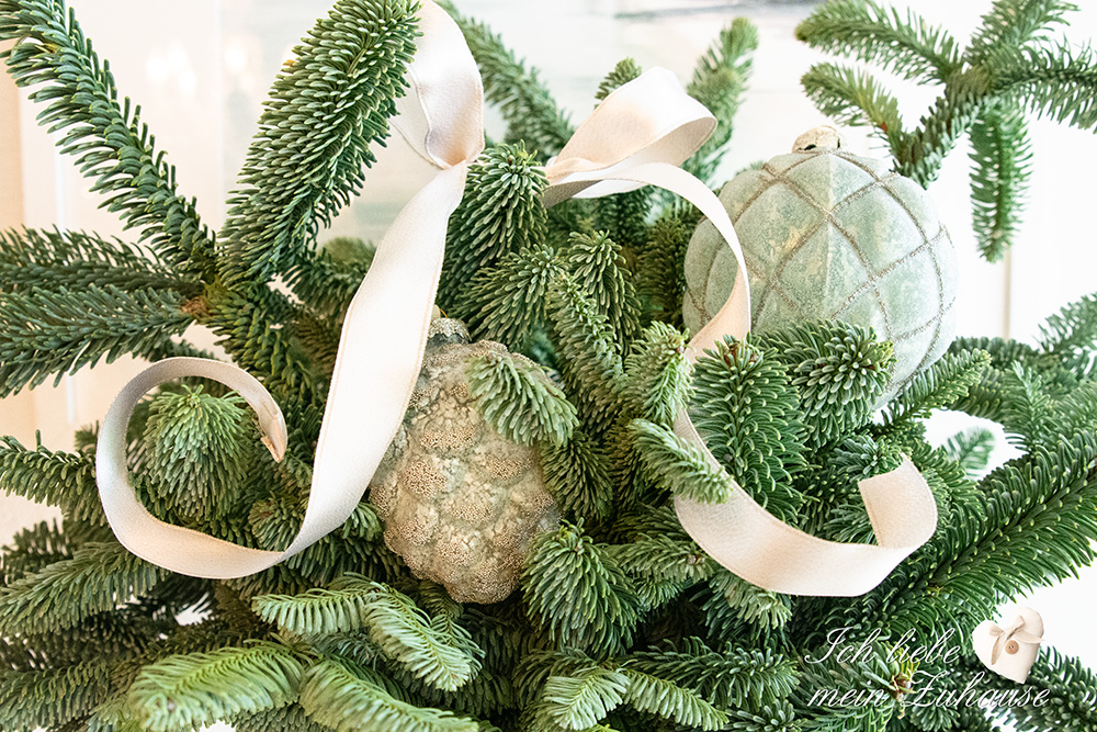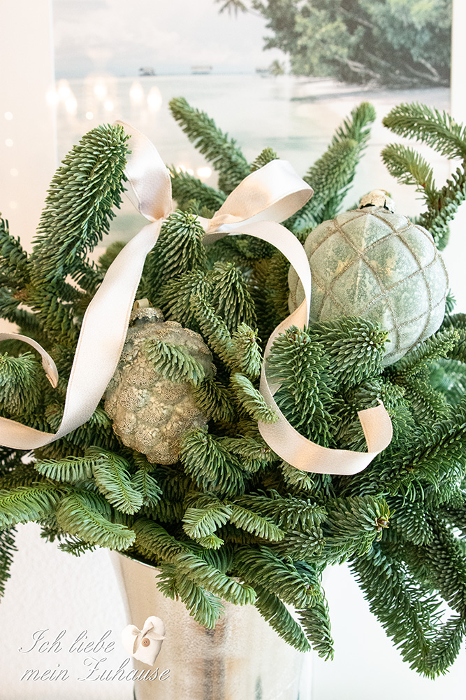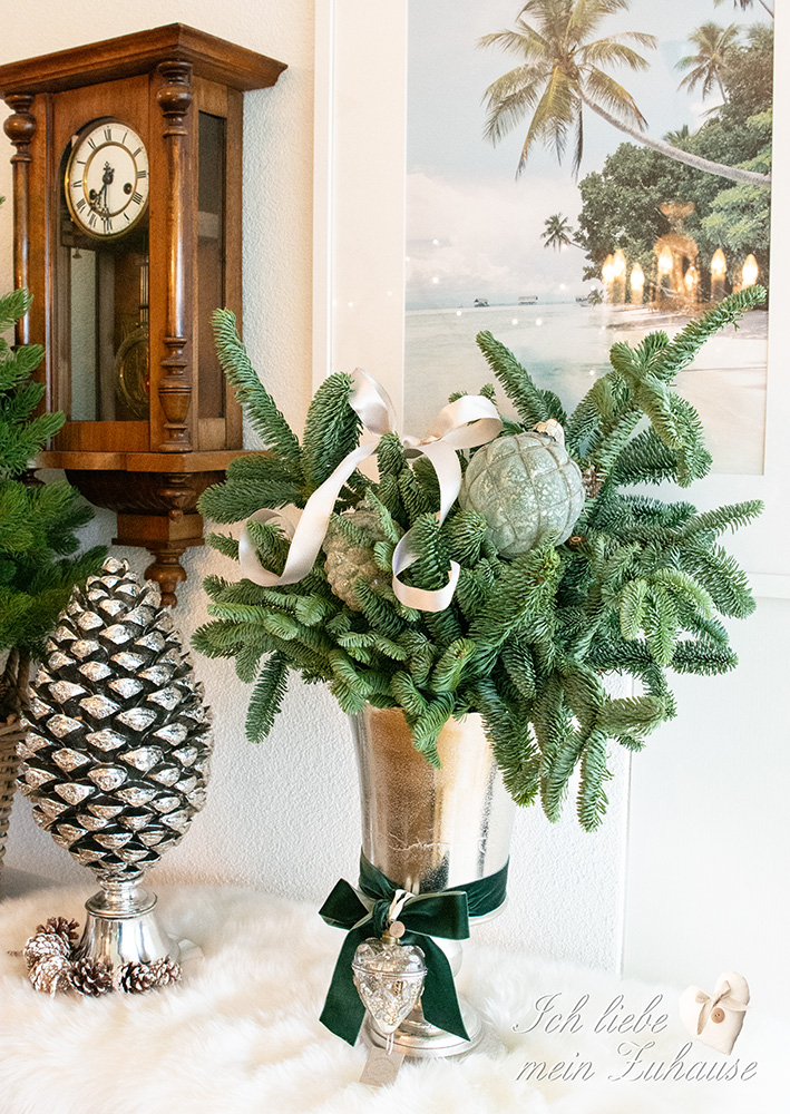 Ich habe unsere Deko ganz natürlich in das bestehende Ambiente eingefügt und selbst das Bild mit den Palmen an der Wand gelassen. Die Farbe der Tannenzweige fügt sich sogar hervorragend in die Farben des Bildes ein. So können Sie einfach und schnell eine harmonische Dekoration gestalten, bei Ihnen Zuhause. Die Christbaumkugeln sind alle von Lene Bjerre, sowie auch der silberne Zapfen.