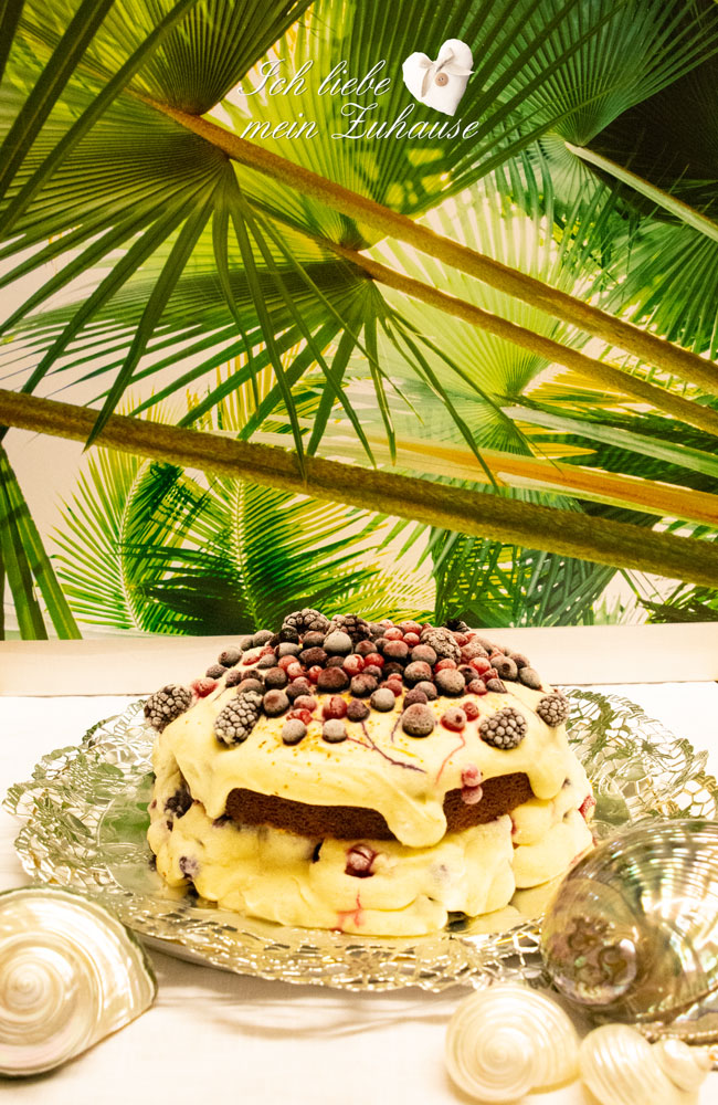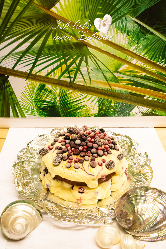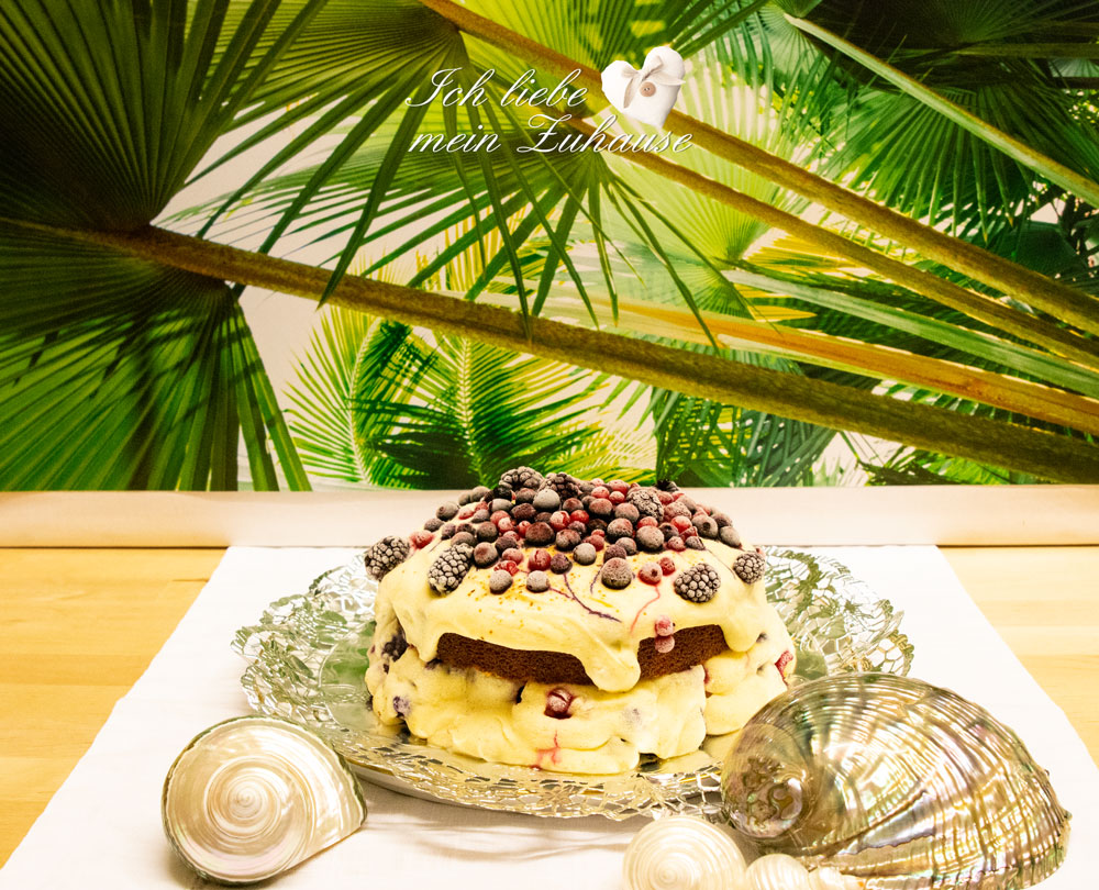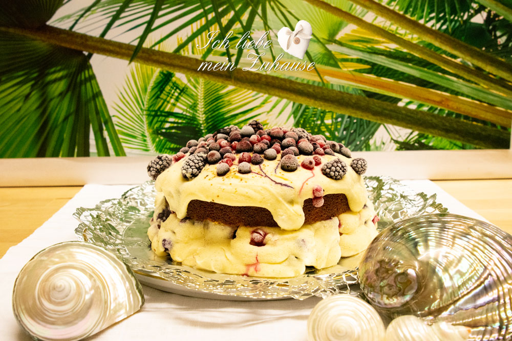 Auskühlen lassen und den geschlagenen Rahm darunter ziehen. Die Torte damit befüllen, bzw. immer eine Schicht Füllung, dann den Tortenboden darauf legen und zum Schluss mit den Beeren garnieren. Ab in den Tiefkühler und einige Stunden tiefkühlen.