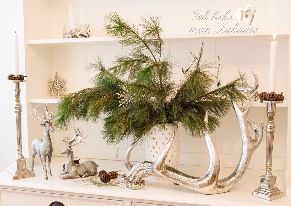 Die imposanten Geweihe beeindrucken immer und sind ein wahrer Blickfang für jeden Raum. Die elegante Hirsch-Weihnachtsdekoration in grün, weiss und silber habe ich bewusst schlicht gehalten. So kommen die einzelnen Objekte wunderbar zur Geltung und haben Raum, um zu brillieren. Gerade im Luxusbereich ist oft weniger mehr.