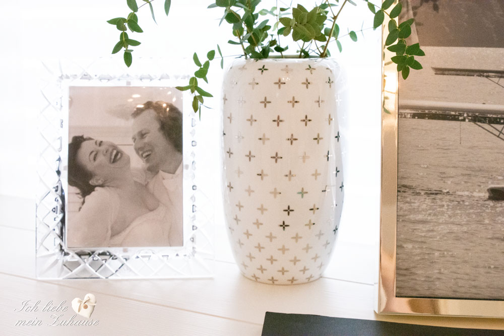 Mit Fotos in schönen Fotorahmen zaubern Sie schnell und einfach ein stimmungsvolles Ambiente. Frische Blumen oder selbst gesammelte Äste in einer stilvollen Vase, einige Büro-Accessoires und Ihr Homeoffice ist bereit. Die Fotorahmen sind von Lene Bjerre aus der Cristel Collection und aus der Austin Collection.