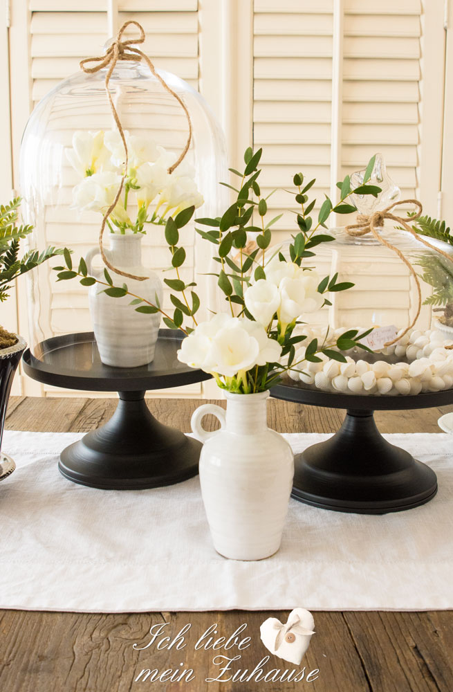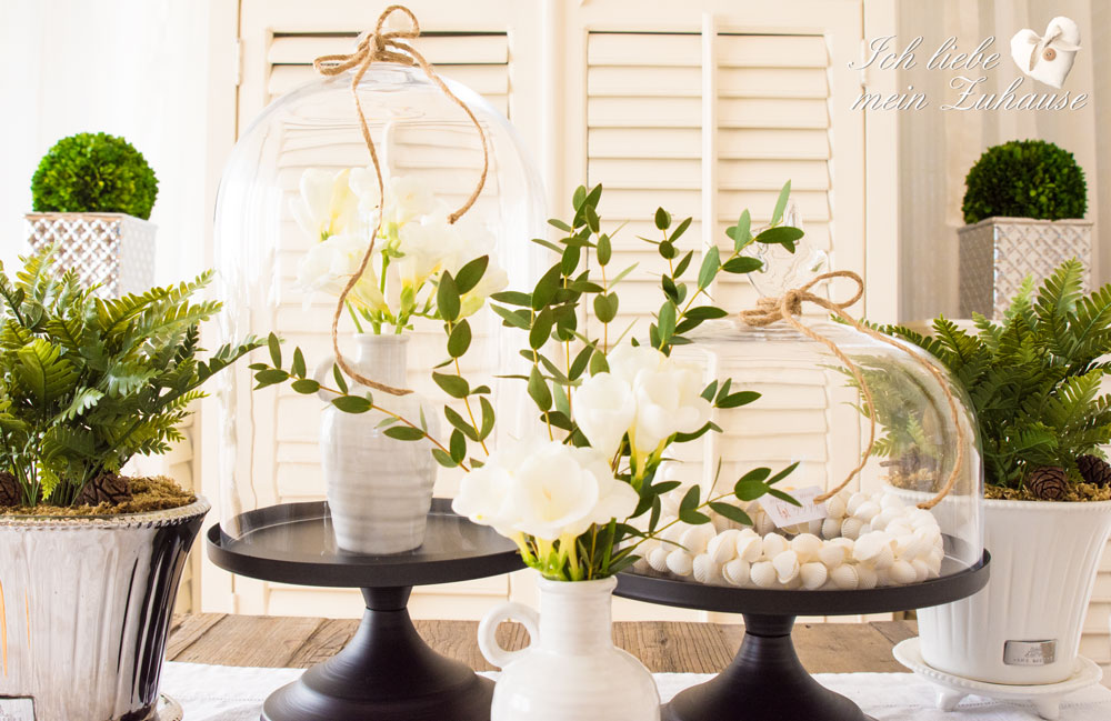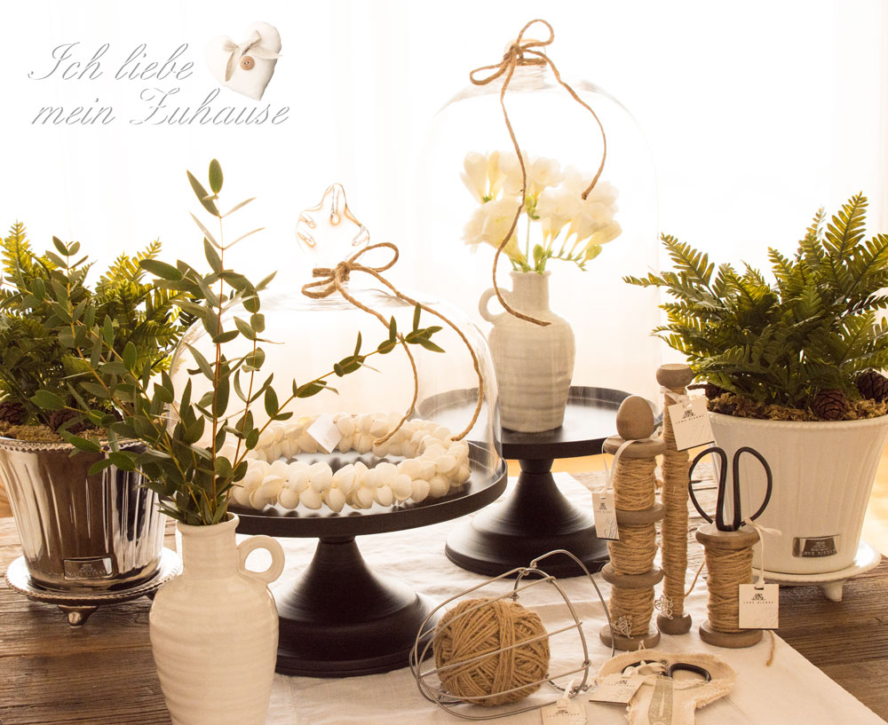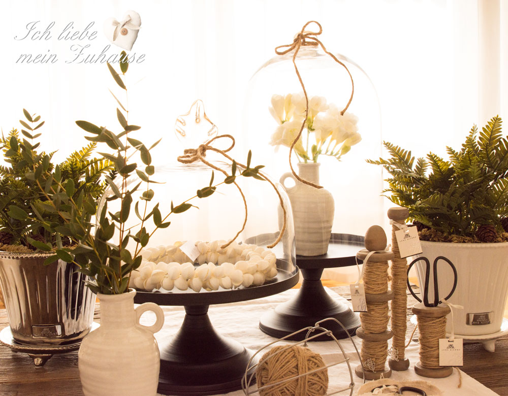 Ein schönes Zuhause macht glücklich. Die eleganten mundgeblasenen Glasglocken auf dem Metall-Fuss, finden Sie hier und hier. Sie sind ein Highlight in jedem Raum. Die speziellen Keramiktöpfe in weiss und silber gibt es von Lene Bjerre. Nicht nur für Pflanzen, sondern auch für Blumensträusse wunderbar geeignet.