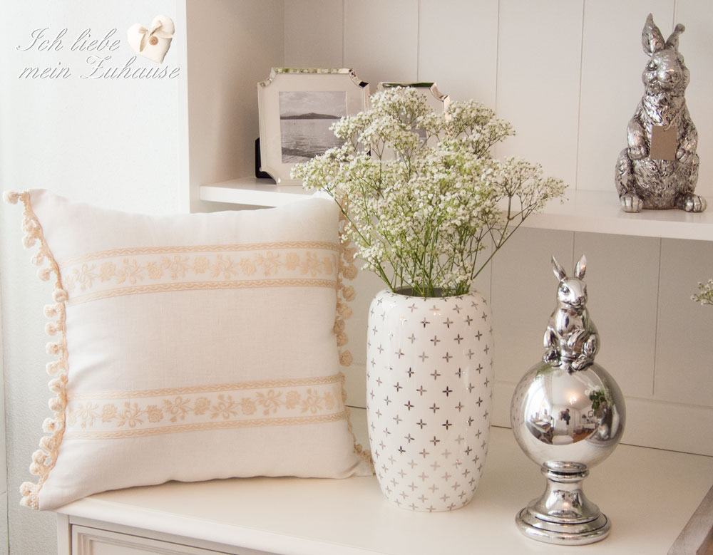 Die edle weisse Vase mit den silbrigen Sternchen und das kuschlige weisse Leinen-Kissen mit den Pompons und den zarten Rosen, verkünden Frühlingsgefühle im Garten. Die silbrigen Hasen eignen sich nicht nur für die Osterdekoration, sondern sind auch das ganze Jahr oder den ganzen Frühling über ein edler Blickfang für Ihr Zuhause.