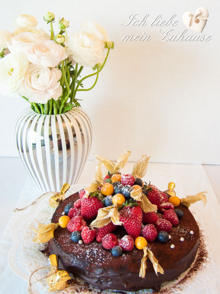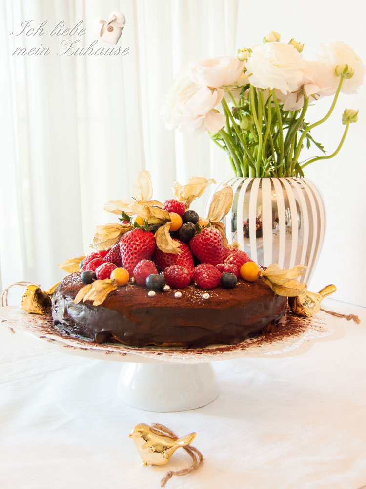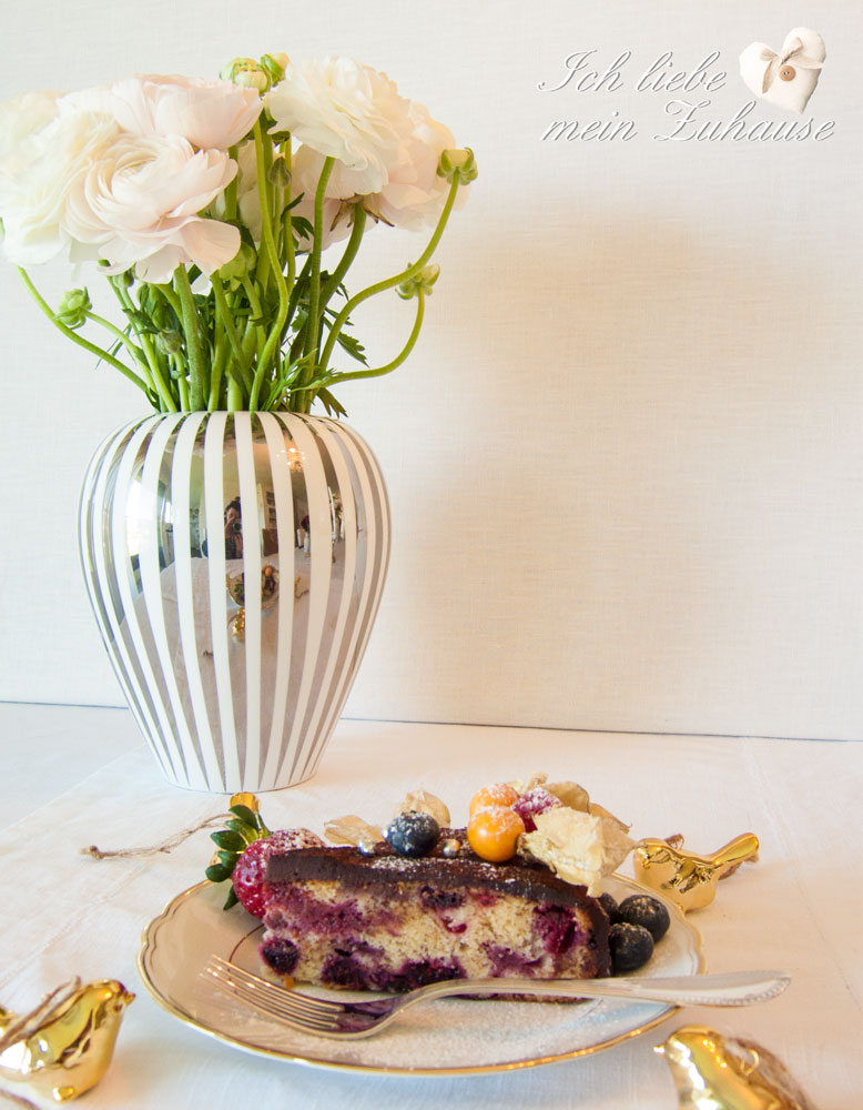 Heute präsentiere ich Ihnen meine neuste leckere Kuchen-Kreation. Mit ganz viel von den feinsten Beeren innen und aussen, schmeckt er fruchtig frisch, schön feucht und dank des Schokolade-Überzuges, schokoladig süss und fein. Einfach köstlich und ein wahrer Beerentraum mit Schokolade für Ostern. Wunderschöne Oster-Dekorationen dazu finden Sie hier. Wundervolle Vasen von Lene Bjerre gibt es hier.