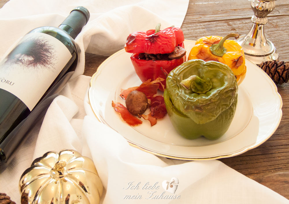 Olivenöl erhitzen, Zwiebel und Knoblauch bei mittlerer Hitze andünsten, Hackfleisch und Pilze dazugeben und abschmecken. Die Gewürze und Pelati mitbraten, mit Rotwein ablöschen und 15 Minuten köcheln lassen. Die Peperoni in eine feuerfeste Form stellen, mit der Masse füllen, den Peperoni-Deckel auflegen. Mit Bouillon auffüllen und im Ofen zugedeckt ca. 30 – 45 Minuten bei ca. 180° schmoren bis sie schön weich sind.