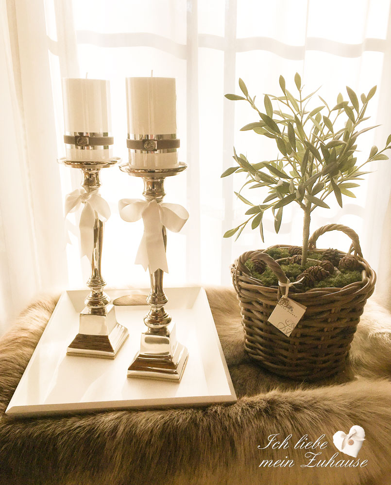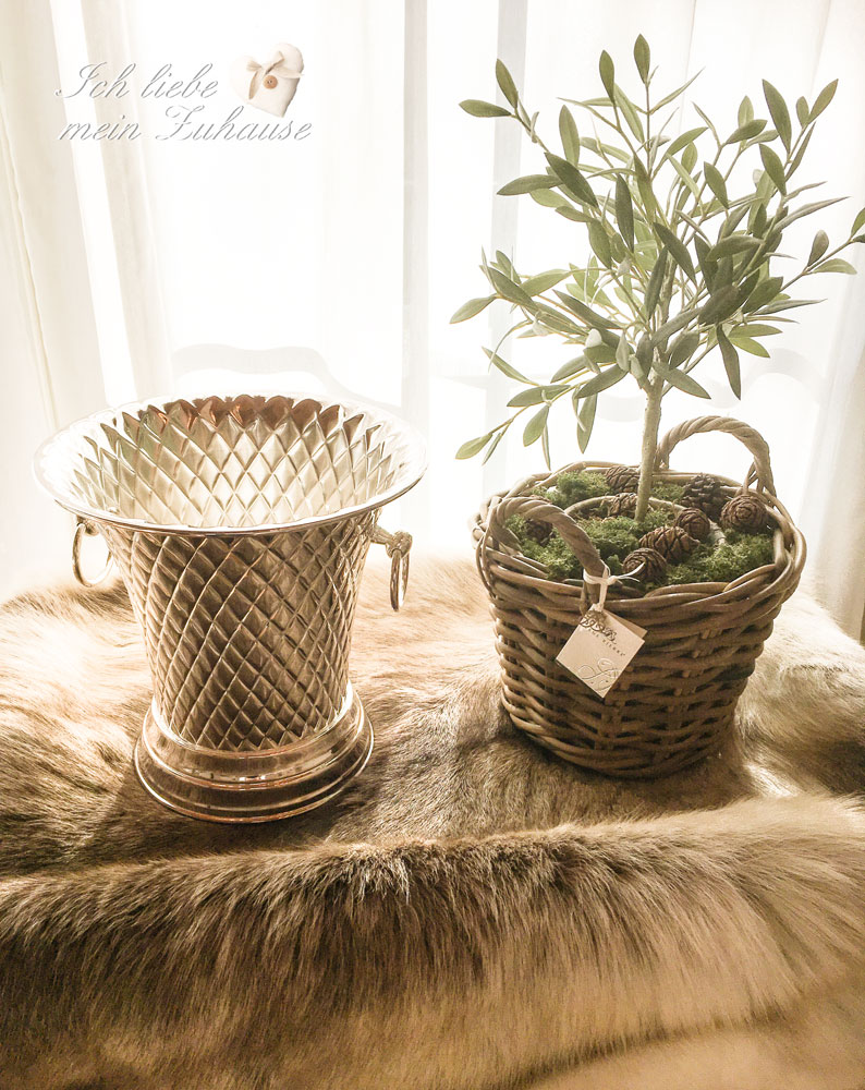 Ein Champagner-Kühler von Edzard ist sowieso ein Highlight und kann auch ohne Champagner, einfach als Blickfang dekoriert werden. Zudem ist er schnell zur Hand, wenn Sie ihn benötigen. Eine natürliche Note verleiht einem Raum eine grüne Pflanze. Sie muss gar nicht echt sein, denn sie sorgt auch so für Natürlichkeit und Wohlbefinden. Den Olivenbaum von Lene Bjerre aus der Flora Collection habe ich zusätzlich noch in einen Rattankorb gestellt und mit Moos und Mammutbaum-Zapfen schön ausgarniert. Sie können ihn aber auch direkt aufstellen, weil er bereits in einen Topf gepflanzt ist.