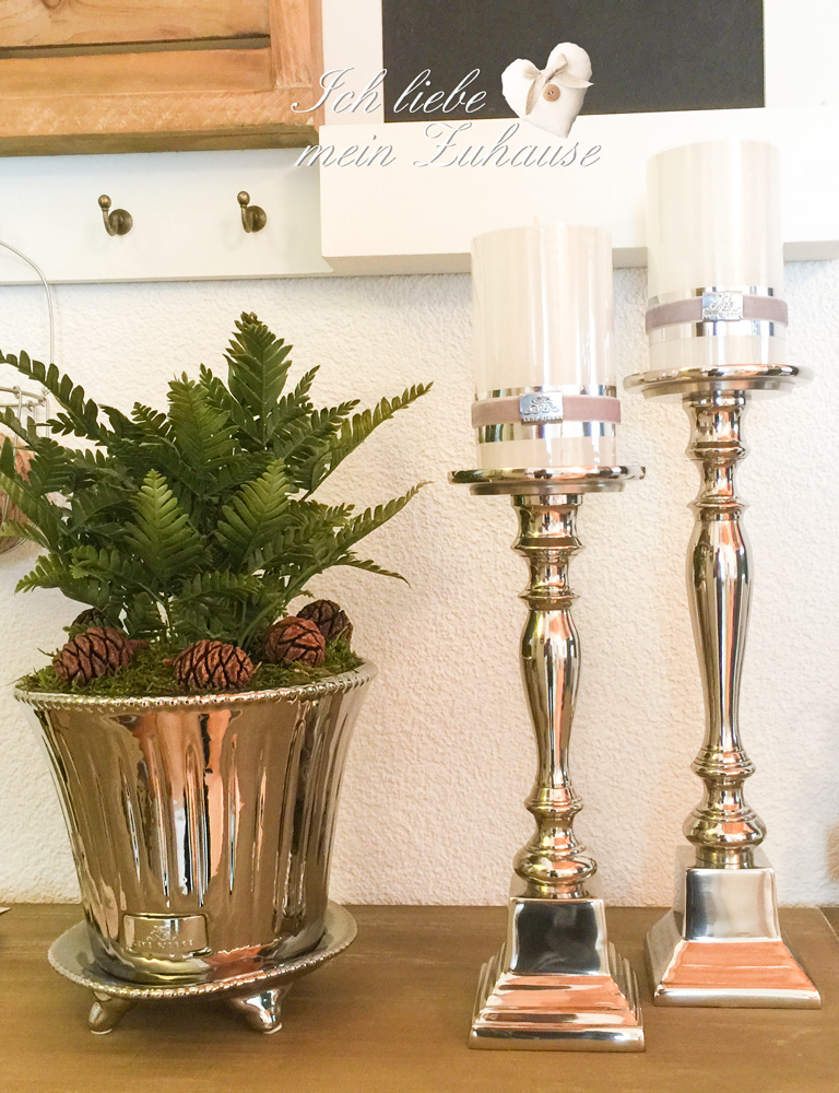 Dazu noch elegante silbrige Kerzenständer stellen und schon haben Sie das Garten-Feeling auch Zuhause. Die beiden silbrigen Kerzenständer sind aus der Christina Collection limited Edition, small und large, von Lene Bjerre. Es können dazu sowohl schmale, als auch dicke Kerzen verwendet werden. Beides sieht hübsch aus. Der silbrige Keramiktopf ist aus der Paulina Collection, large von Lene Bjerre.