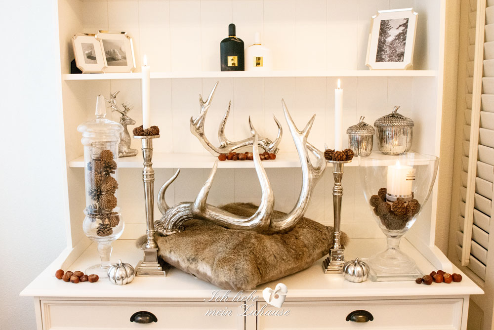 Lieben Sie eine Herbst-Dekoration mit Eleganz und Klasse? Dann ist diese Dekoration bestimmt perfekt für Sie. Imposant für ein Entrée, ein Highlight im Wohnzimmer und stilvoll für ein Büro. Die silbrigen Geweihe verleihen jedem Raum Brillianz als „Statement Pieces“. Die glanzvollen Geweihe sind von Lene Bjerre, in small und large. Die wunderschönen mundgeblasenen Gläser eignen sich als Blickfang, um sie mit herbstlichem Naturmaterial, wie verschiedene Zapfen, Eicheln, Kastanien, etc. zu dekorieren. Die grossen Gläser finden Sie hier und die Bonbonniere hier. Die Tischuhr Clotilde ist von Lene Bjerre. Auch Muscheln sehen in den Gläsern sehr edel aus. Die Fotorahmen bestücke ich gerne mit Naturfotos in schwarz-weiss, damit sie gut ins Interieur passen. Von Lene Bjerre gibt es eine grosse Auswahl an schönen Fotorahmen.