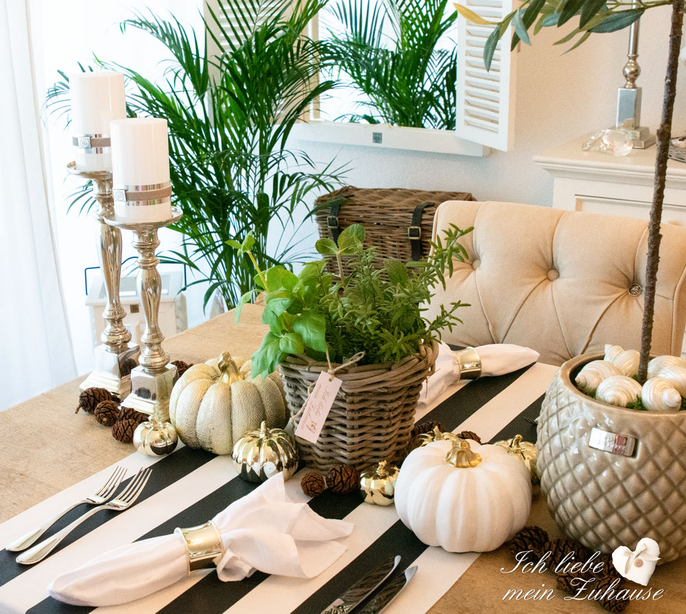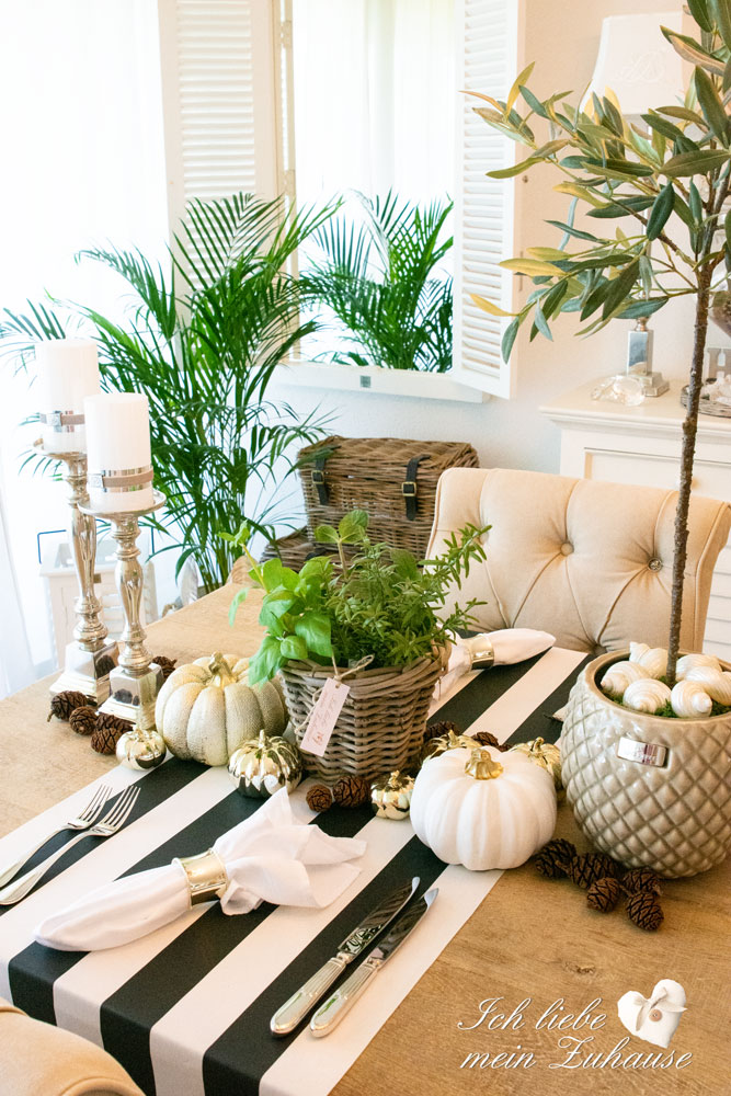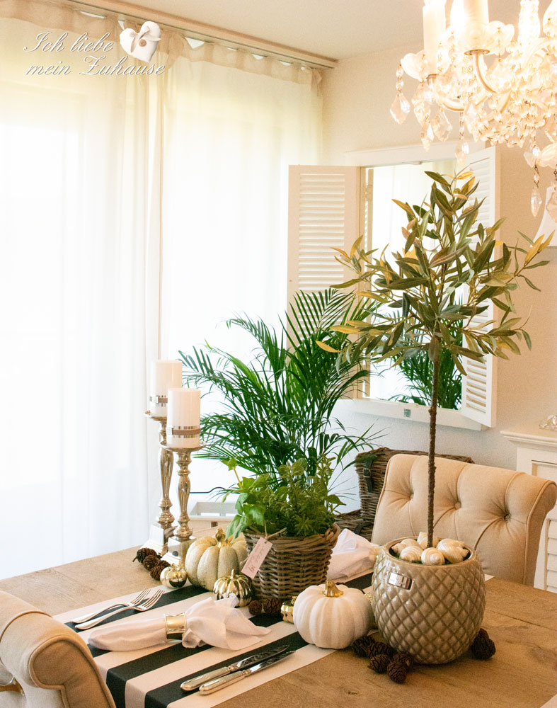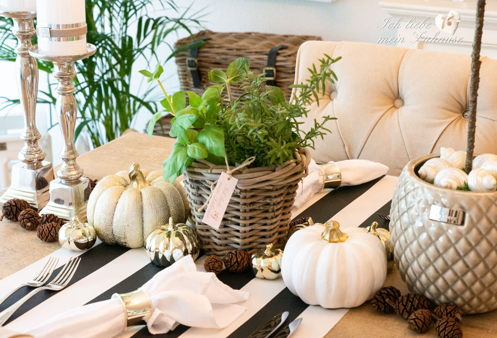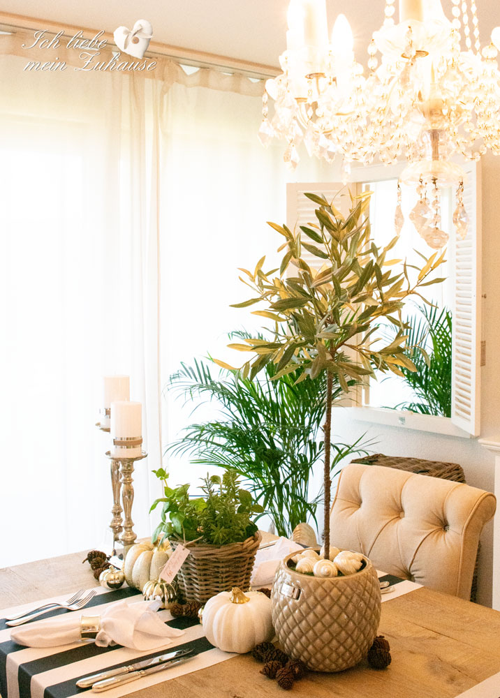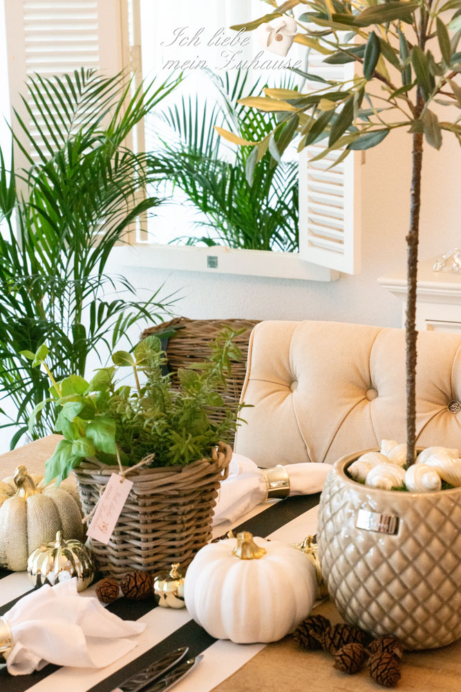 Dekorieren Sie mit Kürbissen, Kräuterkörben, einem Keramiktopf Rosabelle mit Olivenbaum und vielem mehr…..