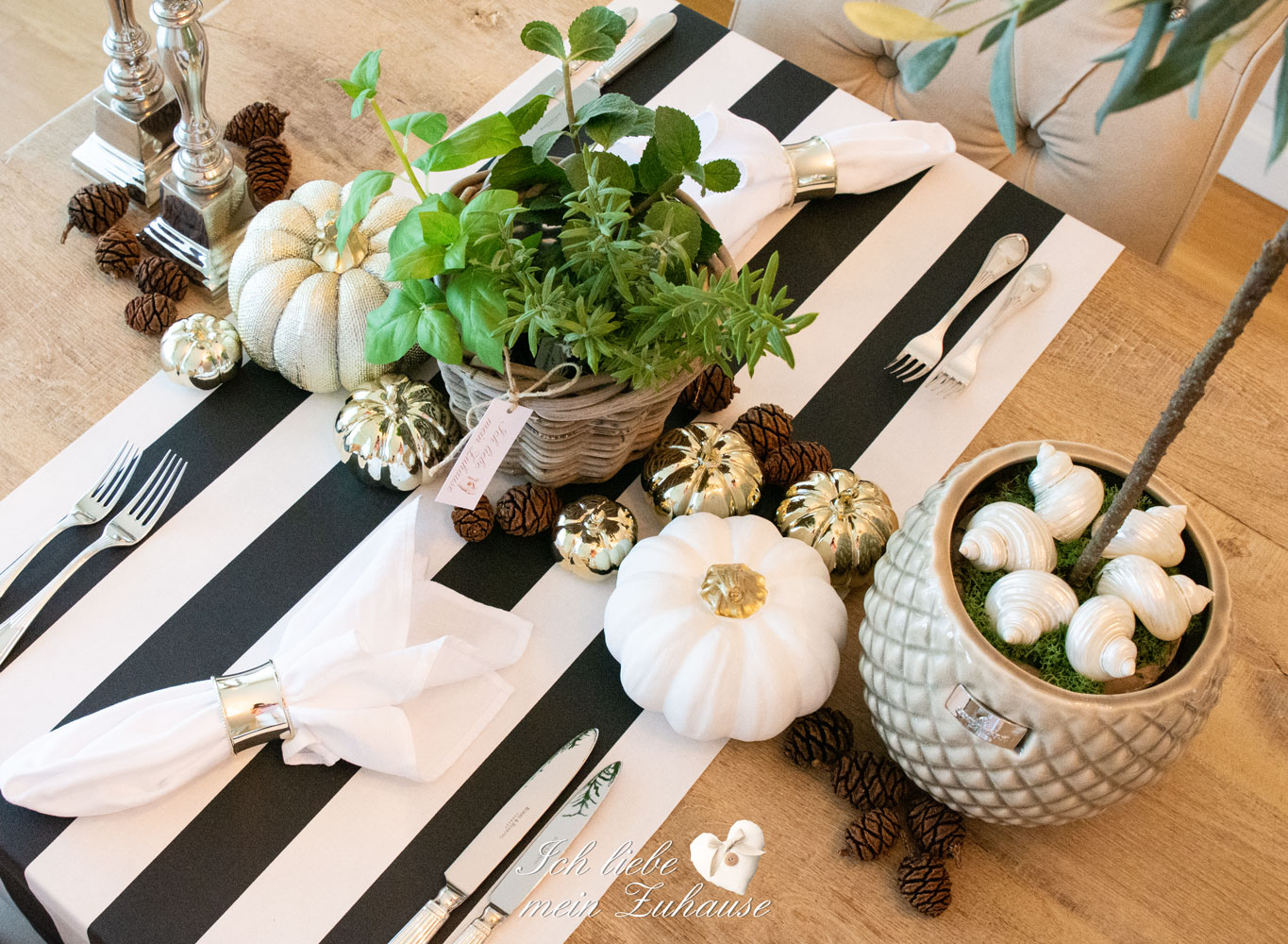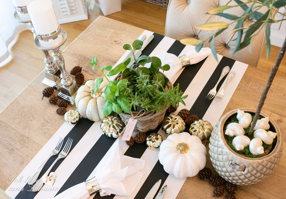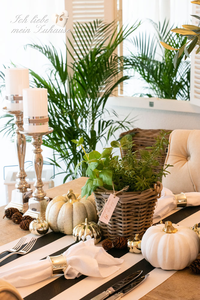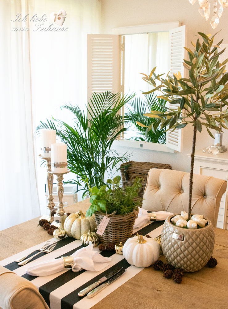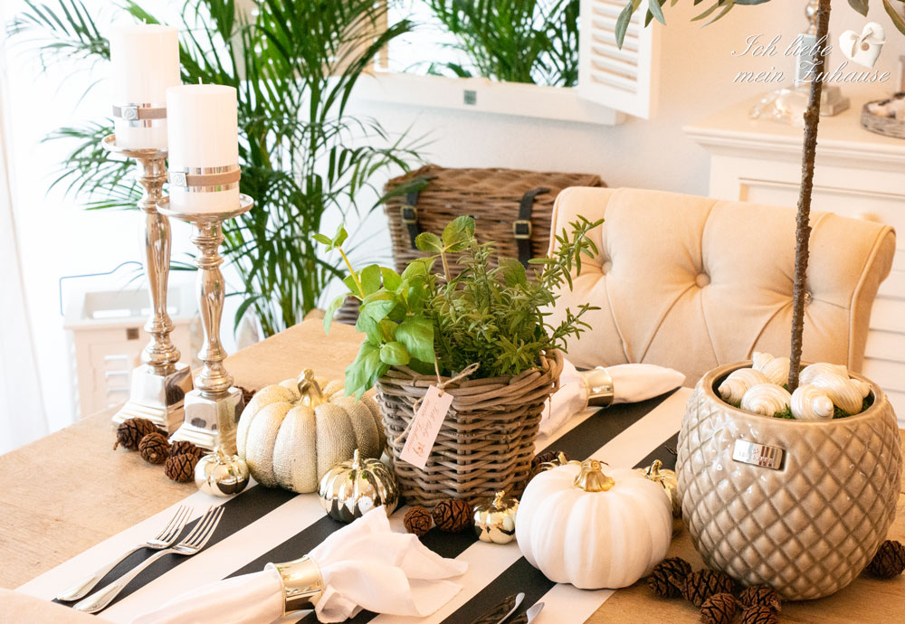 Dekorieren Sie mit Kürbissen, Kräuterkörben, einem Keramiktopf Rosabelle mit Olivenbaum und vielem mehr…..