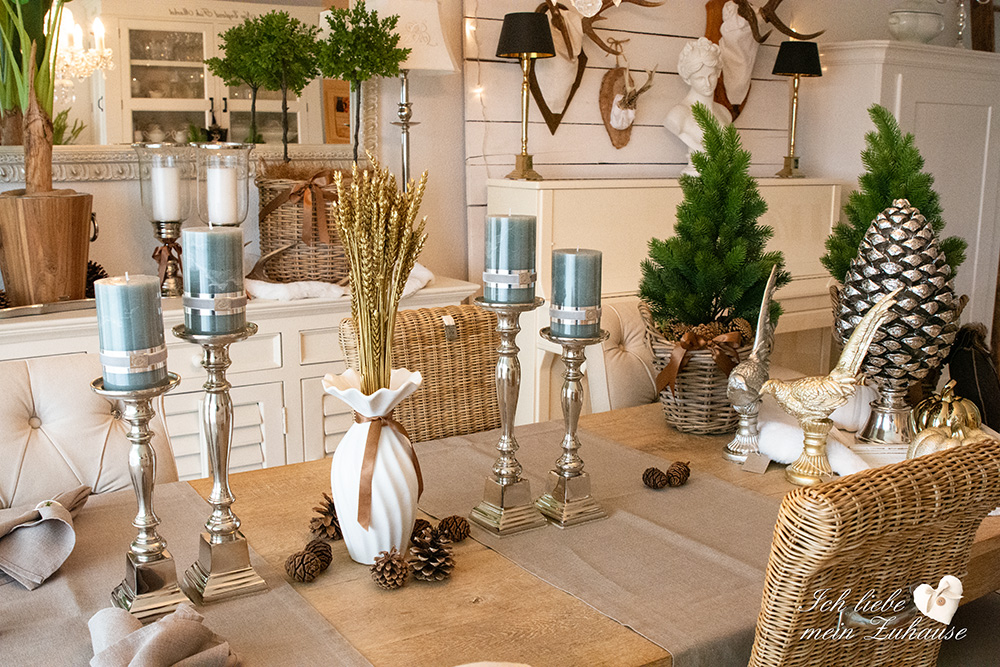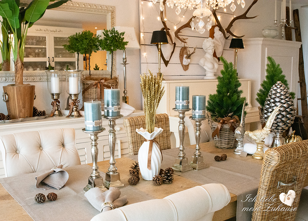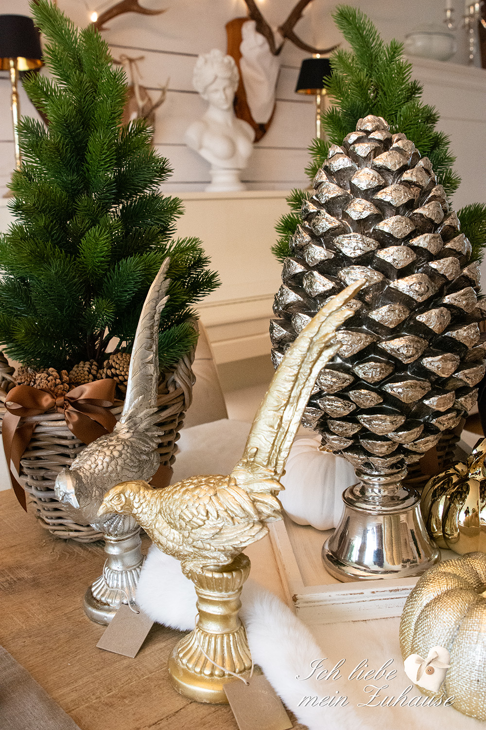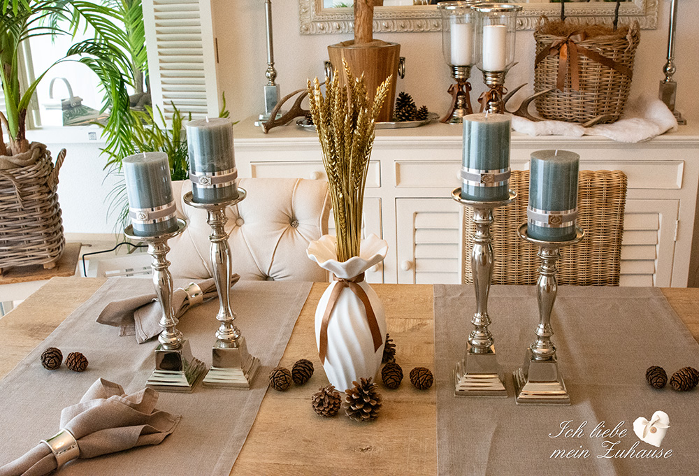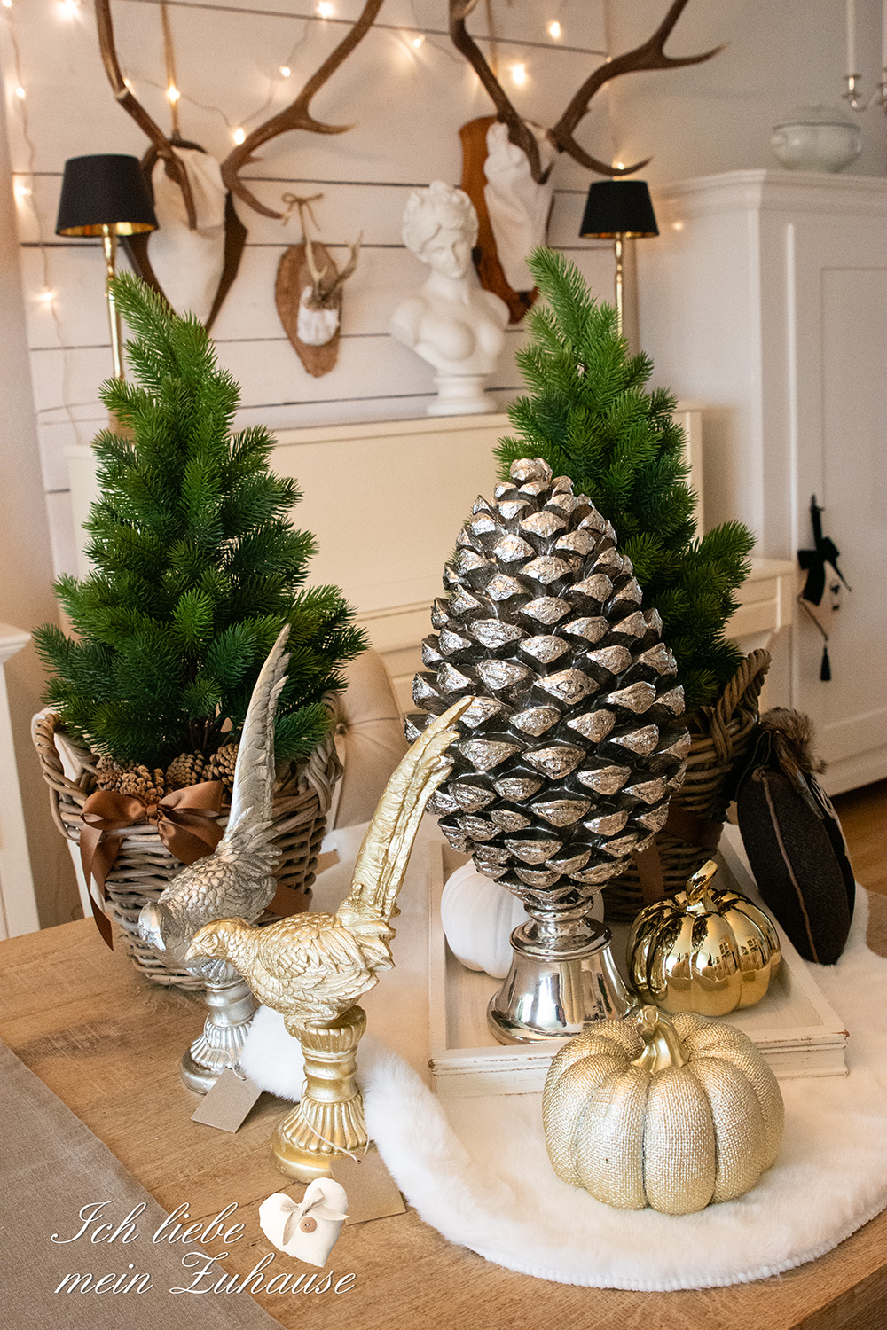 Lassen Sie sich verwöhnen von traumhaft schönen Accessoires und geniessen Sie den Herbstzauber mit Ich liebe mein Zuhause. Bringen Sie den goldenen Herbst in ihr Zuhause, mit Kissen im Chaletstil von Altalena, Vasen und edlen Kerzenständern von Lene Bjerre, hier und hier, grossen Zapfen, Fasanen und noch vieles mehr.