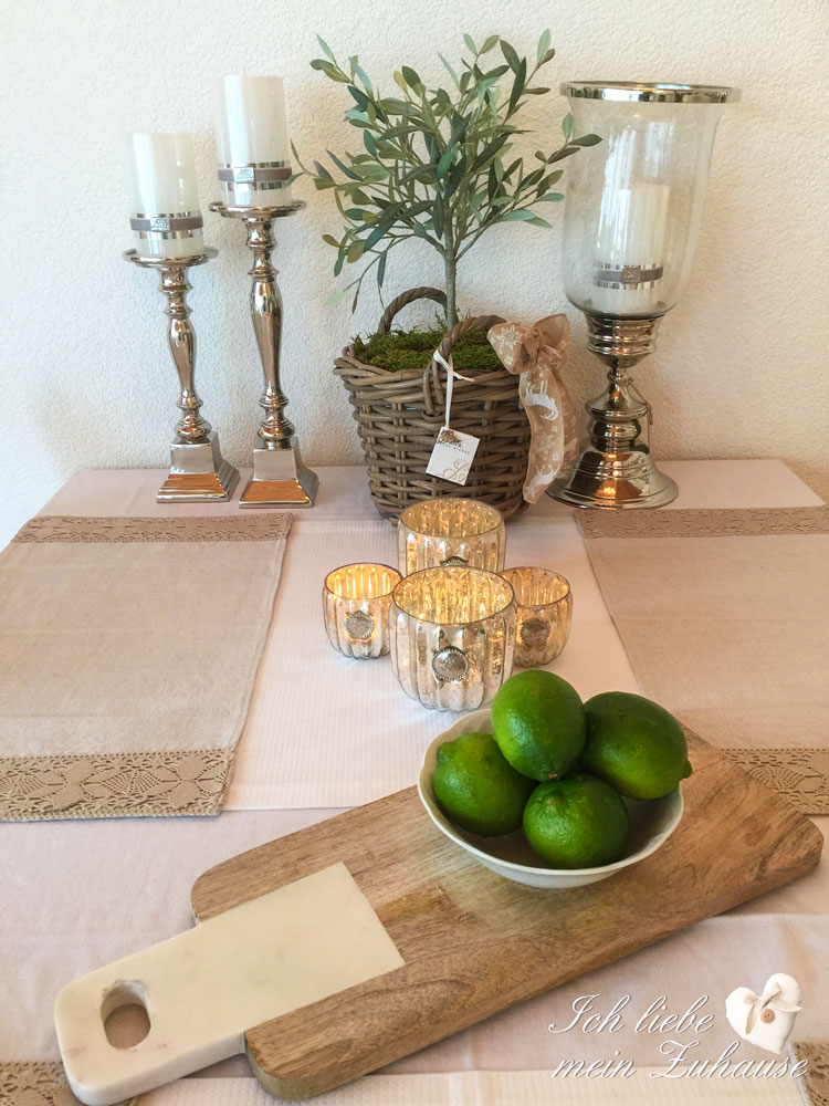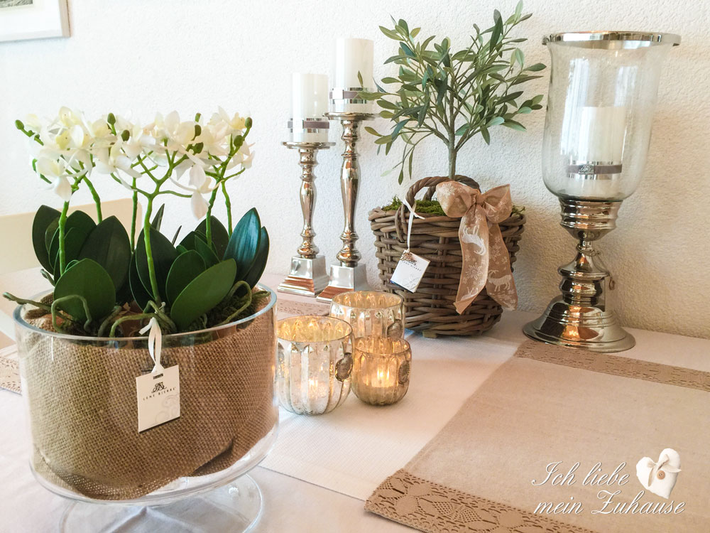 Unseren Esstisch ziert nun ein weisses Tischtuch, mit weissen Tischläufer und Tischsets darauf. Mit künstlichen Pflanzen dekoriert, die immer gut aussehen und den edlen silbrigen Kerzenständer von Lene Bjerre, ist der Tisch schnell dekoriert. Oft lasse ich den Tisch auch nach dem Essen so dekoriert, damit ich nicht vor jedem Essen neu dekorieren muss. Zudem ist er so gleich den ganzen Tag ein stimmungsvoller Anblick zum Wohlfühlen und Geniessen.