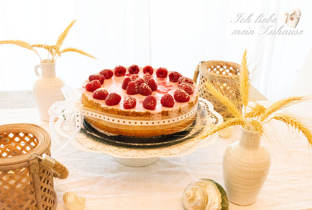 Diese köstliche Torte habe ich speziell für den Vatertag gebacken. Sie ist frisch, leicht und fruchtig. Perfekt für den Sommer und für alle, die eine leckere, leichte Torte lieben. Die Himbeeren verleihen feinstes, fruchtiges Sommer-Feeling und dank dem Magerquark ist sie leicht und lecker. Zur Sommertorte gehört natürlich auch eine sommerliche Tischdekoration zum Wohlfühlen und Geniessen. Dekorieren Sie zum Beispiel mit einem schönen Blumenstrauss, mit Teelichtern oder Windlichtern, lässiger Tischwäsche und einigen verspielt arrangierten Muscheln.