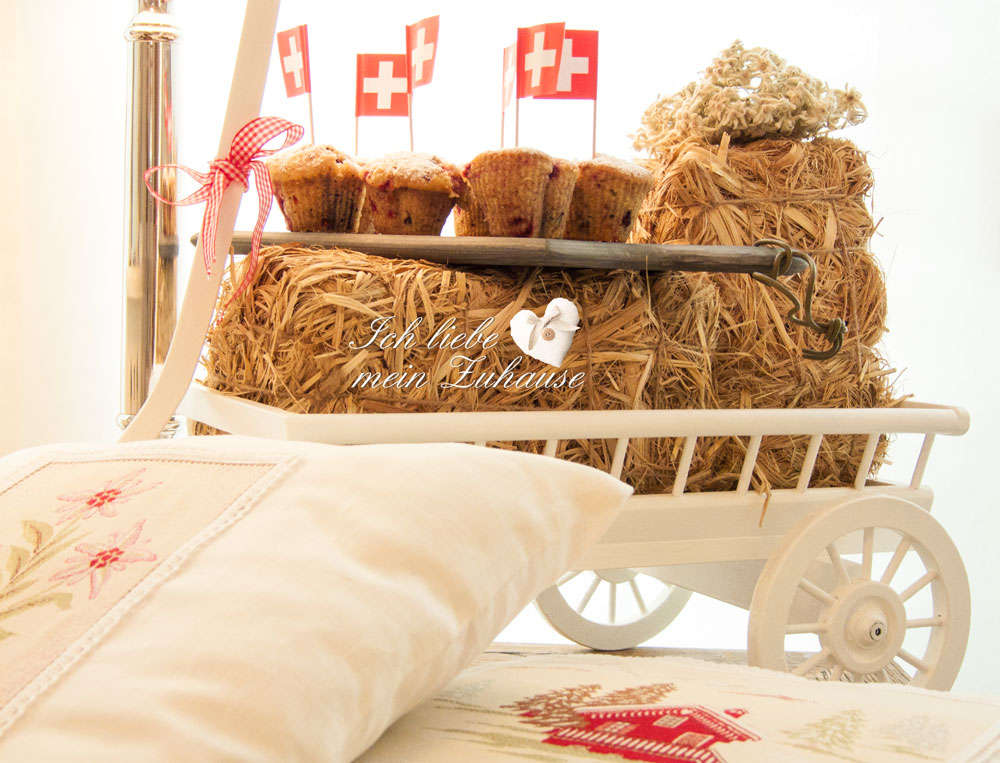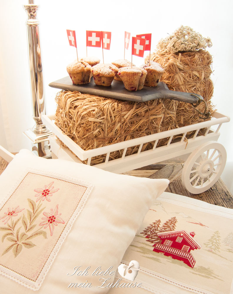 Die Schoko-Himbeermuffins habe ich ganz traditionell im typischen Landhausstil fotografiert. Mit edlen Leinen-Kissen, auf dem Schneidebrett aus Schiefer und auf dem Stroh im weiss bemalten Holz-Leiterwagen. Sogar noch mit getrockneten Edelweiss. Ist das nicht schnuffig? Ich liebe den Landhausstil und hatte viel Freude, diese Deko für Sie liebe Leserinnen und liebe Leser, zu arrangieren. Ich hoffe, Ihnen gefallen die Bilder und ich kann Ihnen damit nicht nur eine Freude machen, sondern Sie auch inspirieren, Ihr Zuhause auch schön zu dekorieren 🙂