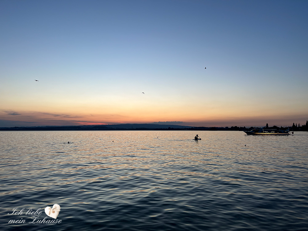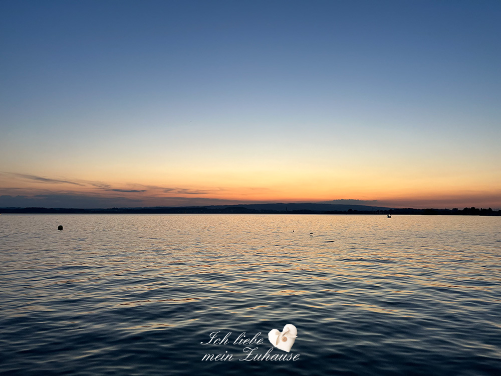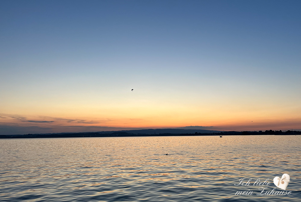 Ich tauche ein in diese schöne Stimmung mit allen Sinnen und bin in Gedanken versunken. Die warme Abendluft umhüllt mich, ich atme den herrlichen Duft des Sees ein, geniesse das Farbenspiel am Himmel und stelle mir gerade vor………….., als mich eine liebevolle Stimme ganz sanft aus meinen Träumen holt mit der Frage: „Petra, wollen wir gehen?“ Ich spürte die warmen Steinplatten am Ufer unter meinen Füssen und sah meinen Mann mit lieben und etwas verträumten Augen an. Ich hätte fast ewig am Ufer stehen bleiben können und voller Hingabe diese Atmosphäre geniessen. Ohne Raum- und Zeitgefühl.