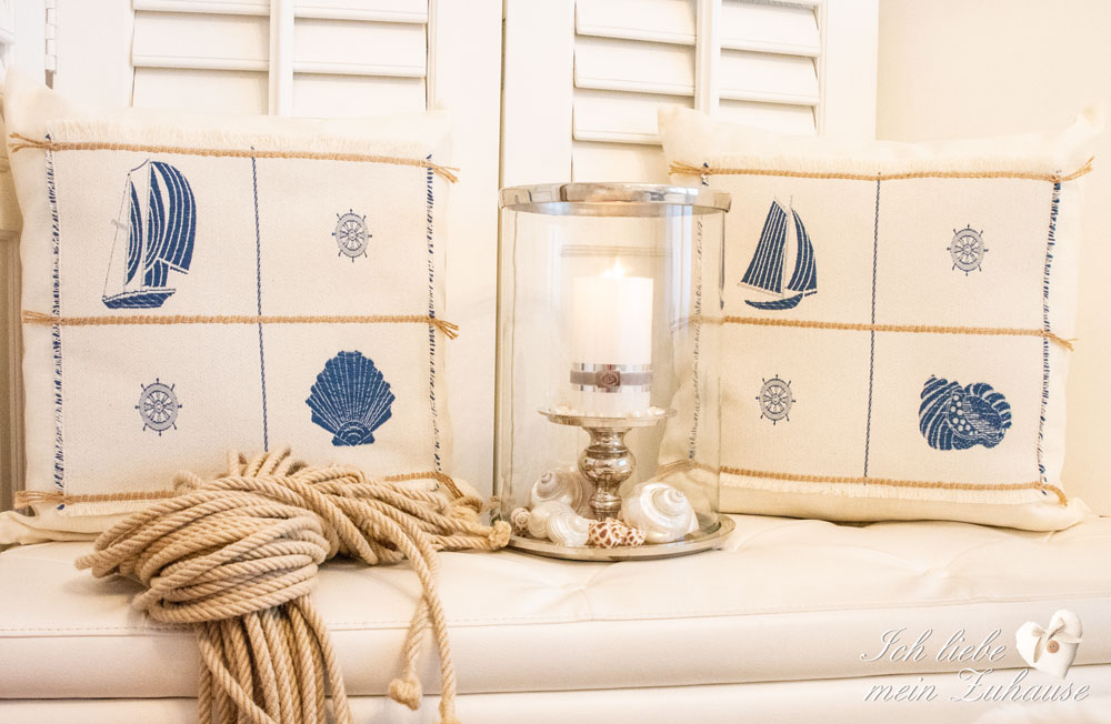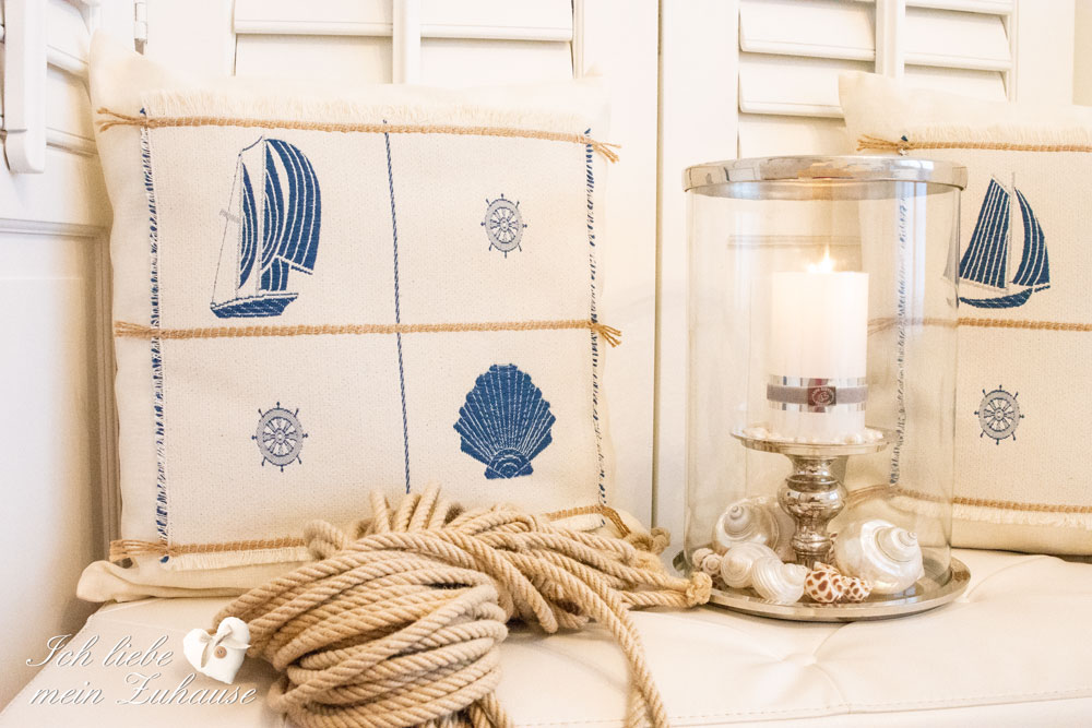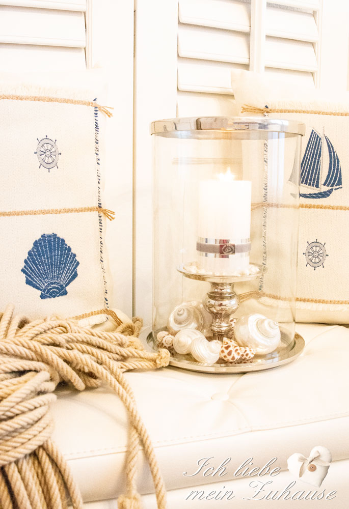 Ich liebe Weiss und setze Farben nur sehr dezent ein in der Einrichtung. Weiss sorgt für Ruhe, Wohlbefinden und Licht. Dieser weisse Seaside-Traum lässt Sie direktes Feriengefühl erleben. Spüren Sie den warmen Sand unter Ihren Füssen bei strahlendem Sonnenschein und blauem Himmel. Mit dem Windlicht von Lene Bjerre aus der Limited Edition und den beiden wunderschönen Leinen-Kissen, hier und hier, schaffen Sie eine Atmosphäre zum Wohlfühlen und Geniessen. Die gestickten navy-blauen Motive wie das Segelschiff, das Steuerrad und die Muscheln sorgen für ein edles Ambiente. Das Windlicht lässt sich in jeder Jahreszeit wieder anders dekorieren. Für den Sommer dekorieren Sie einfach mit verschiedenen Muscheln. So ist das Ferienfeeling perfekt.