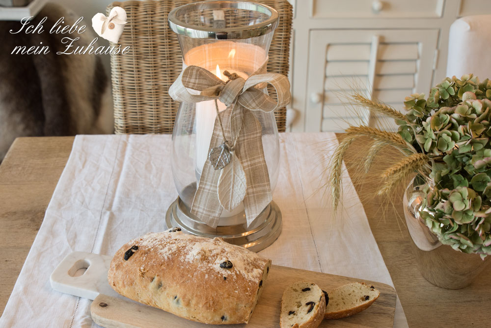 Für die warme Atmosphäre auf dem Tisch, habe ich das Windlicht dekoriert. Das dekorierte Windlicht aus der Floralina Collection von Lene Bjerre, stellen Sie einfach auf die weissen Leinen-Tischläufer Marlia und schon haben Sie einen stimmungsvollen Tisch. Das Windlicht lässt sich je nach Jahreszeit mit verschiedenen Bändern und anderen Deko-Accessoires verzieren. Am Band hängt ein Blatt aus der Delia Collection von Lene Bjerre.