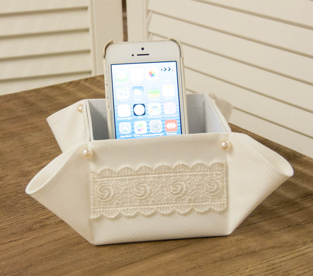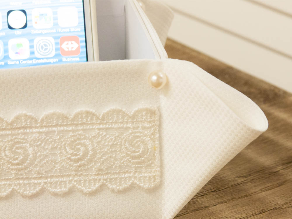 Eine traumhafte Deko-Box für Ihr Smartphone aus edlem Stoff, mit schimmernden Perlen und zarten Spitzen, die einen Hauch von Luxus verströmt. Überall ein geschmackvoller „eyecatcher“. Für ihr Schlafzimmer, für ihr Bad, für ihr Wohnzimmer, einfach ein must have.