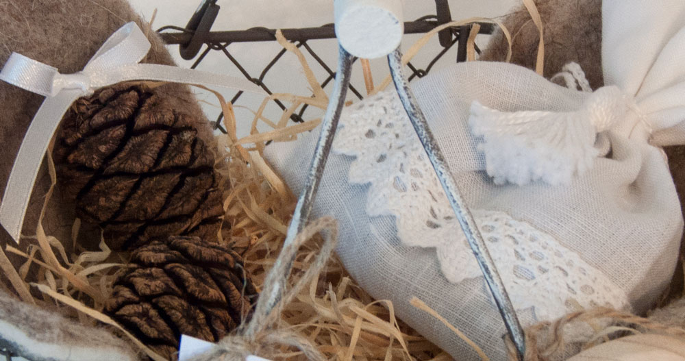 Körbchen mit Herz und Duftsäckli mit Spitze und Quaste. Kuschlig und heimelig sieht dieses Körbchen mit Holz-Herz, Zapfen und Duftsäckli aus. Als Dekoration ein wahrer Blickfang im Landhausstil.