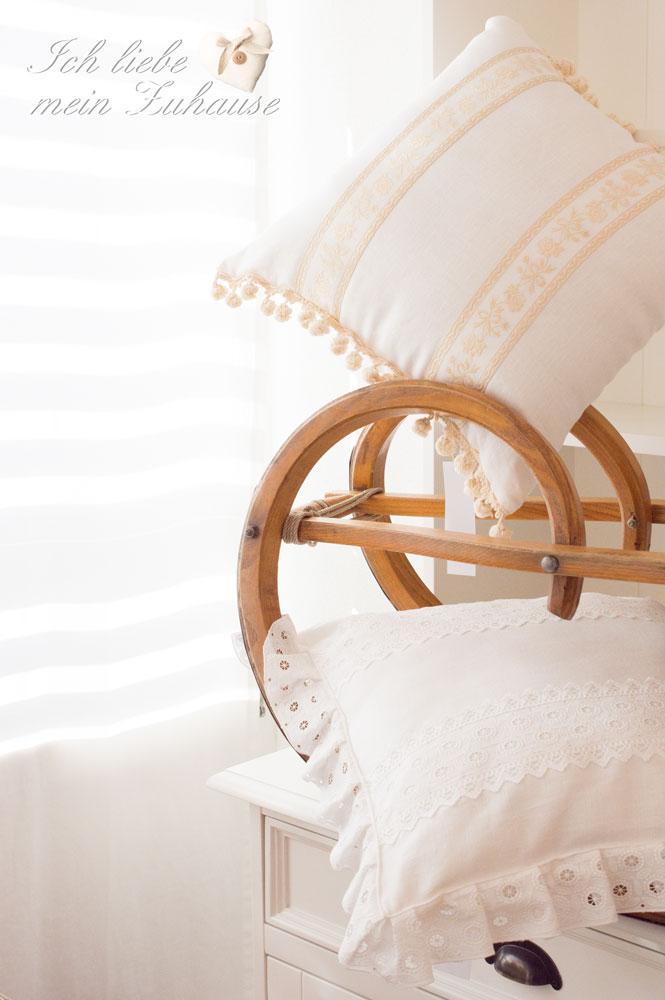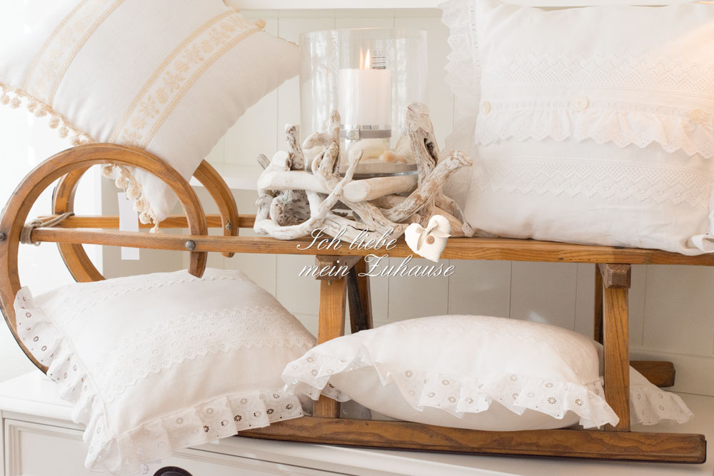 Danach kuscheln wir uns in die weissen romantischen Kissen, zünden die Kerzen an und schauen verliebt den Schneeflocken zu, die sanft vom Himmel fallen. Ich liebe Weiss und die weichen Kissen sind ein Traum. Mit feinster Spitze, eleganten Rüschen, lustigen Pompons, edlen Perlmutt-Knöpfen oder einem Rosenband verziert. In sorgfältiger Schweizer Handarbeit gefertigt, aus unserem Atelier, speziell für Sie. Nur hier bei uns erhältlich.