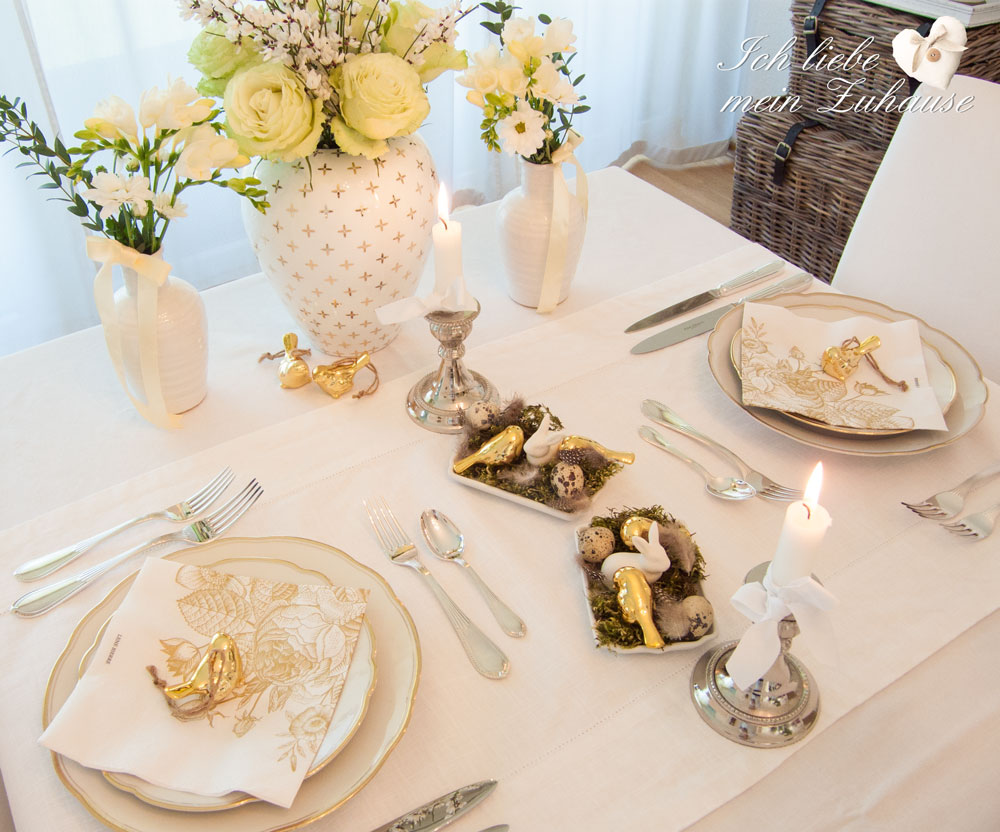 Heute gibt es den 3. Teil der Deko-Inspiration für Ihren Ostertisch. Wir lieben goldene Accessoires, die einen Hauch von Luxus verströmen und mit weiss besonders himmlisch und romantisch wirken. Sie finden alle Ostersachen von Lene Bjerre exklusiv bei „Ich liebe mein Zuhause“.