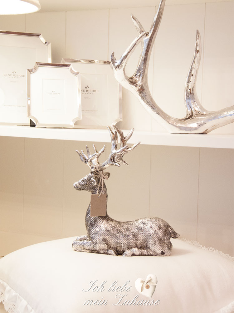 Der sitzende antik-silbrige Hirsch aus dem Winterwald ist aus der Serafina Collection, von Lene Bjerre. Er sitzt auf dem weichen, weissen Luxus-Leinen-Kissen mit Rüschen-Spitzen.